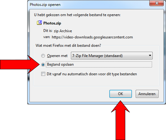 Tik op "Bestand opslaan", kies "OK" en sla de foto's op als zip-bestand op de door jou gewenste locatie.
